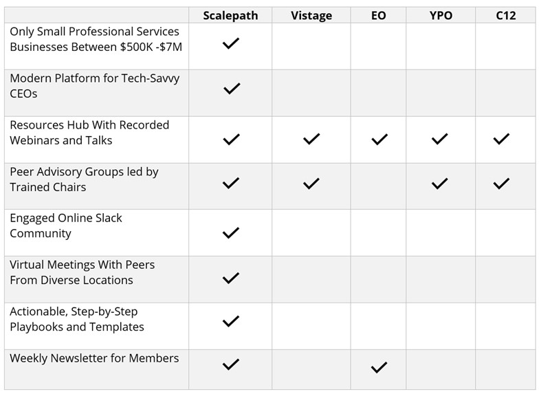 Scalepath clearly fills the Small Professional Services Business niche that differs from many of the other long established Peer Advisory Groups. Just as Scalepath fills its focused small professional services business place, the other players fill theirs in their own way.